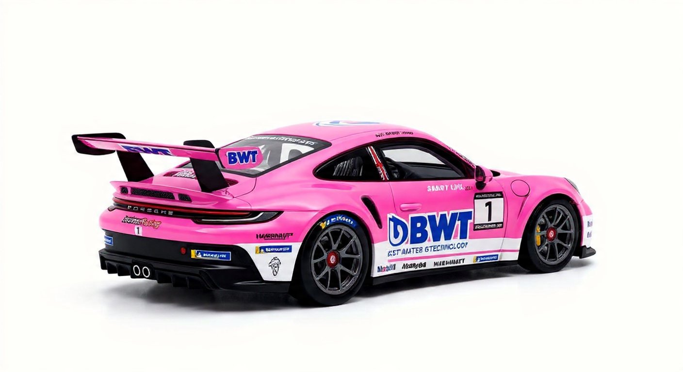 Esta miniatura a escala 1:64 reproduce con gran detalle el diseño del auto #1, incluyendo su distintiva decoración BWT, que se caracteriza por su llamativo esquema de colores. Las proporciones precisas, el acabado de pintura de alta calidad y los elementos aerodinámicos fielmente replicados hacen que este modelo sea una pieza destacada dentro del mundo de las miniaturas automotrices.